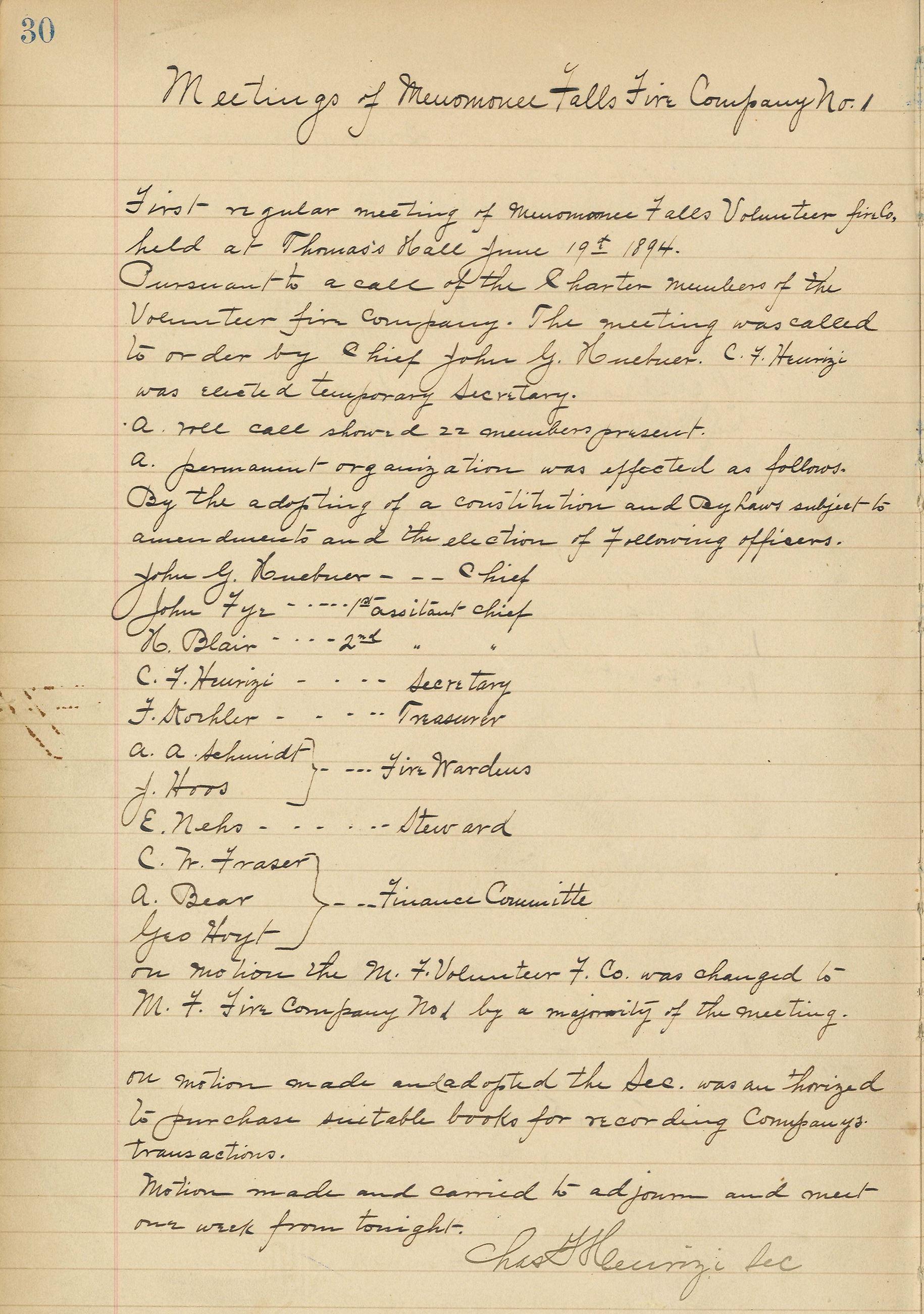 Eight days later, on June 19, 1894, the first meeting of the Menomonee Falls Volunteer Fire Company was called to order.