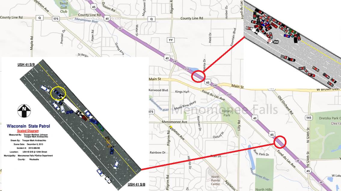December 8, 2013 at approximately 11:23am the Menomonee Falls Communications Center received a 911 call regarding a single vehicle crash on southbound HWY 41/45 and 124th Street in which the driver reported losing control and striking the median wall. The initial responding units were reporting numerous multiple vehicle accidents. There were numerous crashes stretching the entire length of the southbound lanes of the highway. There were two major collisions that required multiple Fire/Police resources.